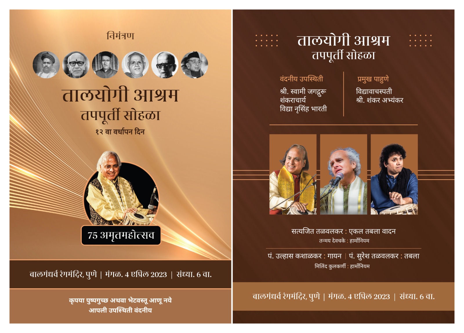 तालयोगी आश्रमाच्या तपपूर्तीनिमित्त मंगळवारी सांगीतिक सोहळा अमृत महोत्सवानिमित्त तालयोगी पद्मश्री पंडित सुरेश तळवलकर यांचा विशेष सन्मान श्री स्वामी सद्गुरू शंकराचार्य विद्या नृसिंह भारती आणि विद्यावाचस्पती शंकर अभ्यंकर यांची प्रमुख उपस्थिती