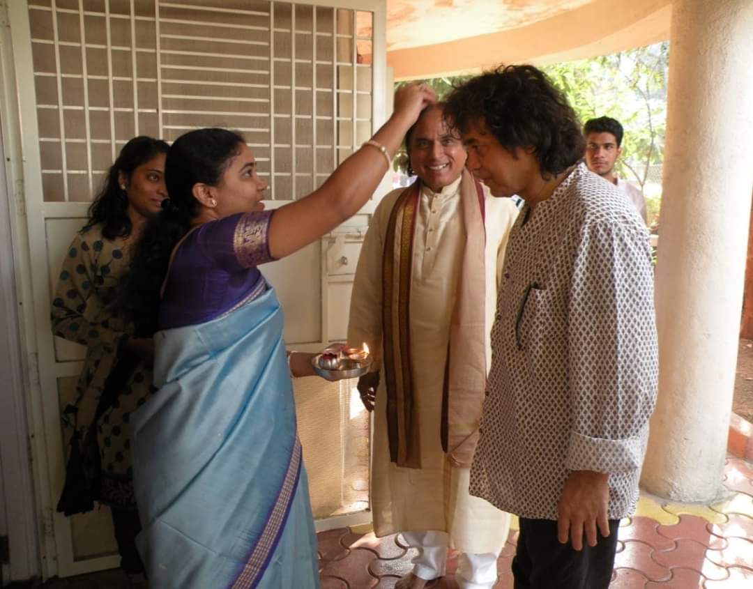 The Taalyogi Aashram, the Gurukul where Padmashree Pandit Suresh Talwalkar teaches a number of young dedicated students, is situated in Dhayari, a suburb of Pune about ten kilometers from the city. It is located in a three-storied bungalow, where some forty odd students live and learn tabla and pakhavaj from Sureshji. He also teaches a few percussionists who play other instruments like Djembe, Kalabash, etc. Panditji himself spends four to five hours in the morning and another four to five hours in the evening at the Aashram, teaching students the intricacies of laya and taal. Students do rigorous riyaz at the Aashram for the rest of the time.